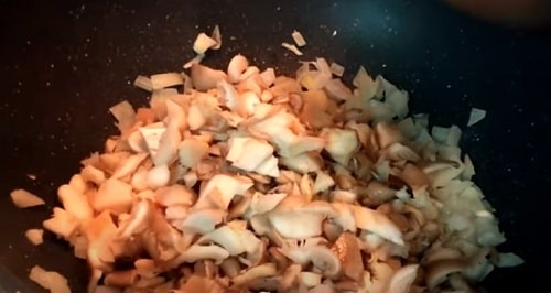 Додайте гриби, перемішайте. Продовжуйте обсмажувати інгредієнти до повної готовності грибів. Спочатку вони виділять багато соку, почекайте, поки він випарується. Потім смажте до красивої рум'яності.