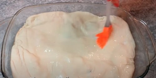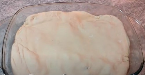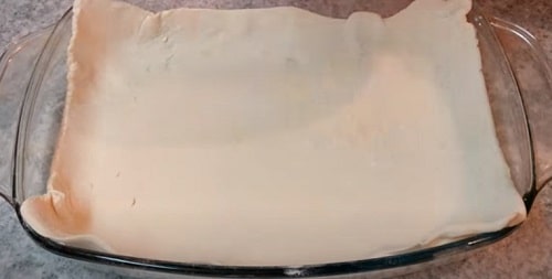 Покладіть прямокутник тесту у жароміцних форму, як на фото, щоб трохи піднімалися краю. Змащувати маслом його не потрібно. Якщо у вашому розпорядженні металевий лист, підстеліть пергамент.