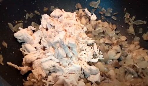 Викладіть курку. Знову розмішайте, підсолити начинку і поперчіть.
