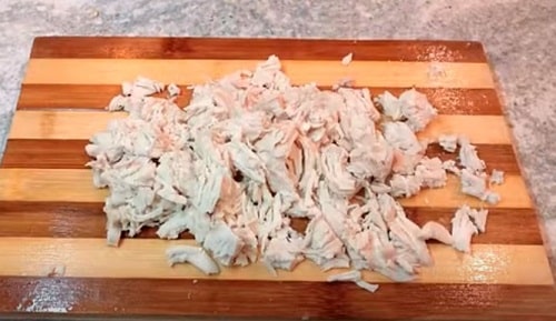 Заздалегідь відваріть курячу грудку в трохи підсоленій воду. Охолодіть, покришите невеликими шматочками.