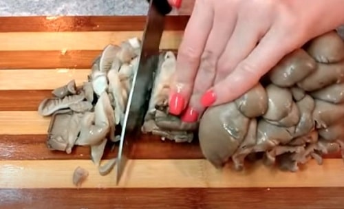 Наріжте гриби. Робіть не дуже дрібно, пропорційно курячому м'ясу, щоб гриби не загубилися в начинці.