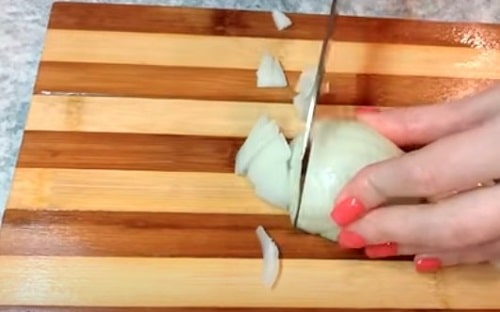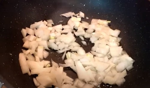 Хлюпніть на сковорідку олію, гарненько розігрійте. Викладіть цибульні кубики. Пасеруйте до легкої прозорості.