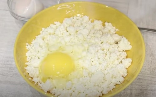 Викладіть сир в миску, розбийте яйце.