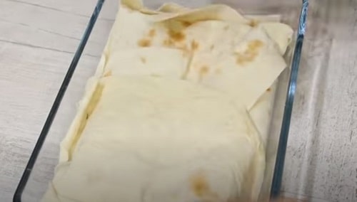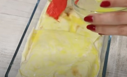 Прямокутники укладіть у жароміцних форму внахлест один на інший, частина листа повинна звисати з бортів. Укладайте в різні боки, щоб дно і боки форми були повністю накриті.