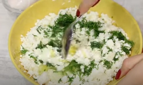 Подрібніть в крихту зелень, відправте в миску. Підсолити і гарненько перемішайте вміст. Одночасно включите на розігрів духовку.