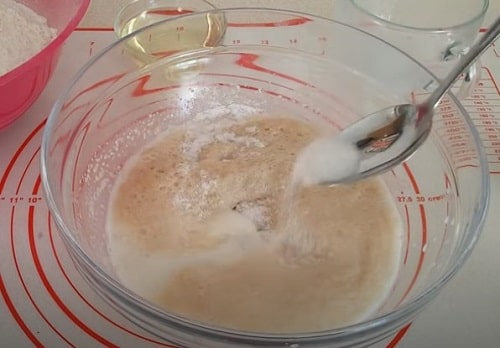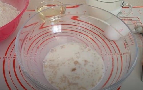 Поставте опару. Засипте в миску сухі дріжджі, влийте трохи теплого молока (трохи зігрійте). Підсипте ложку цукрового піску. Розколотіть вміст. Поставте в тепло буквально на 5-10 хвилин, щоб дріжджі активувалися і почали свою роботу. Про це підкаже пишна шапочка, яка утворилася на поверхні.