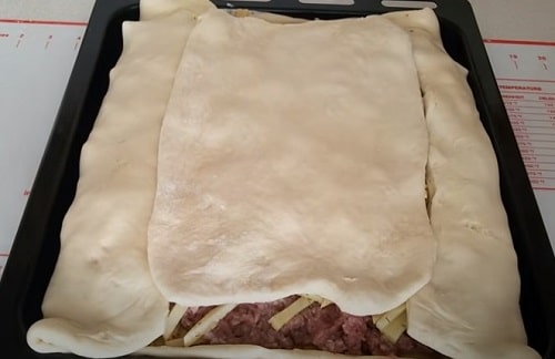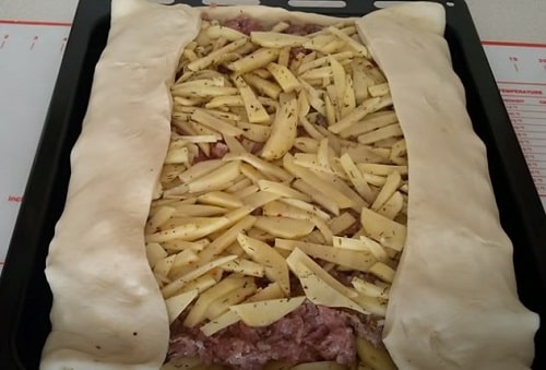 - Зверху розподіліть картопляне пюре. Потім м’ясо. Накрийте залишками тіста, обов’язково розрівняйте його.