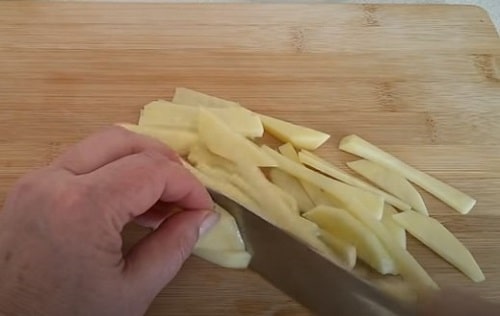 Поки тісто піднімається, займіться начинкою. Почистіть картоплю, наріжте суповий соломкою.