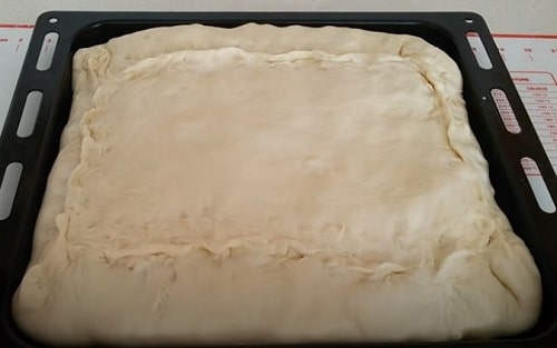 Тепер можна поставити заготовку на расстойку, щоб він трохи піднявся. Але допустимо відразу поставити пиріг в холодну духовку, налаштувавши температурний режим на 180 про С. поки піч буде прогріватися, випічка встигне піднятися в комфортних умовах.