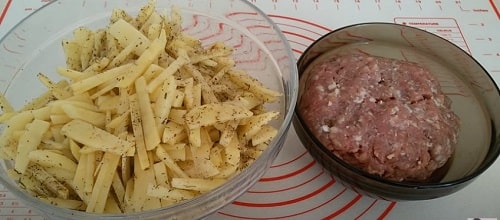 - Напередодні відваріть картопляні бульби і м’ясо (окремо). Розімніть картоплю, м’ясо порізати брусочками.