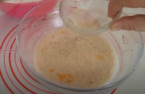 - В окремій посудині збийте яйця з дрібкою солі. Після перелийте в кефірну суміш.