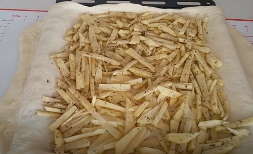 Викладіть картопляний шар. Кладіть половину від вказаного в рецепті, рівномірно заповнюючи не тільки середину пирога, але і куточки.