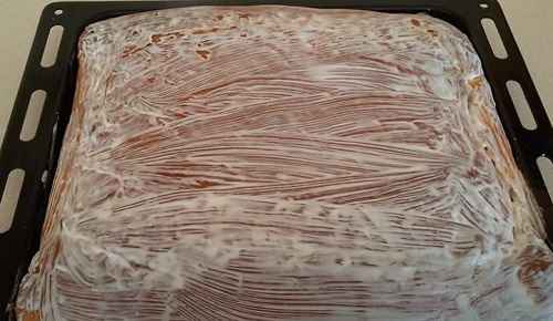 Час випікання – 50-60 хвилин. Не лякайтеся, якщо верх буде твердим. Промажте його сметаною, прикрийте пергаментом, потім зверху укрийте рушником. Залиште хвилин на 20.