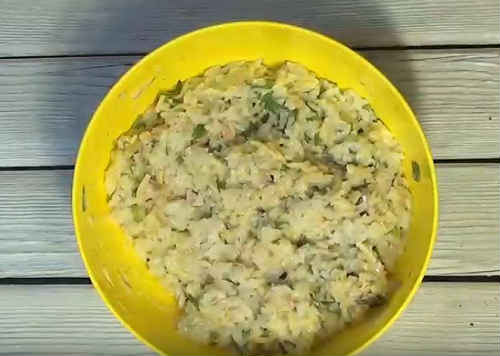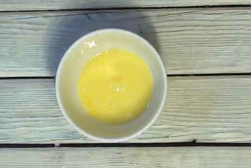 В окремій мисці розколотіть виделкою яйце. Трохи залиште на змащування верху пирога. Інше кладіть в начинку.