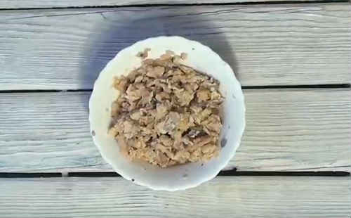 Відкрийте консерви, злийте рідину. Не раджу виливати розсіл повністю. Я практично завжди підливаю трохи в начинку, тоді вона набагато смачніше і соковитіше. Шматочки рибки спочатку розімніть виделкою на великі і маленькі частини. Але сильно не мельчите, інакше будете довго шукати серед рису.