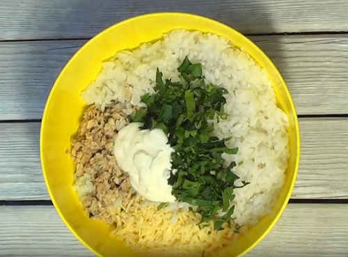 Надішліть сир із зеленню і рибою до рису. Додайте сметану. Гарненько перемішайте масу.