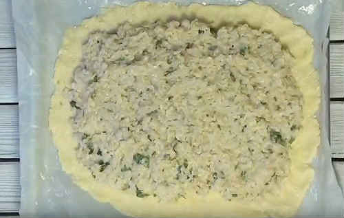 Швидкий пиріг з консервами, рисом і яйцем з листкового тіста