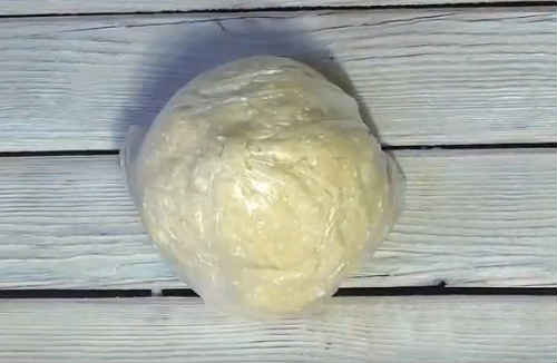 Руками, прямо в мисці, зберіть масу в тугий клубок. Сховайте миску під плівку. Поставте на полицю холодильника приблизно на 30 хвилин.