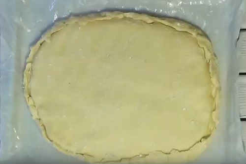 Розкачайте другий пласт, накрийте начинку. Акуратно защипайте краю пирога.
