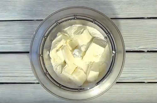 Порубаєте масло невеликими шматочками, відправте до борошна. Раджу попередньо трохи заморозити масло, тоді працювати з ним буде легше.