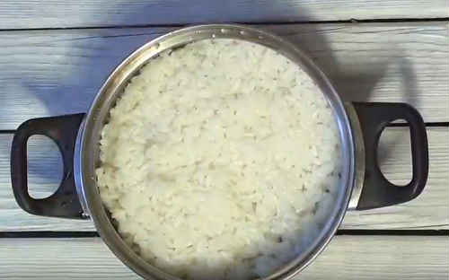 Щоб приготувати начинку, завчасно відварити в трохи підсоленій воді рис. Постарайтеся зварити його правильно, розсипчастим, тоді з’єднувати крупу з іншими інгредієнтами буде легше. Пропорції крупи і води 1:2. Охолодіть рис, розмішайте.