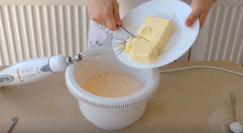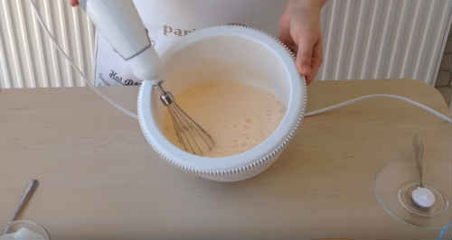Почніть з збивання яєць. Вбийте в миску, попрацюйте міксером. Маса трохи побіліє і стане пінитися.