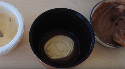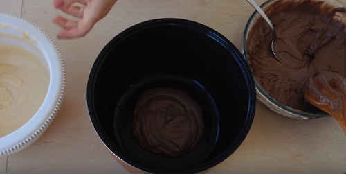 Поверх темного тіста, також в центр, покладіть світле. Не перемішуйте і не допомагайте розтікатися.