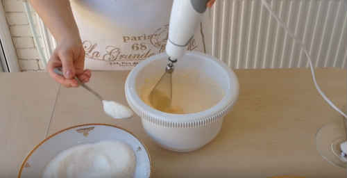 Не вимикаючи гаджет, почніть підсипати цукор. Кладіть по парі ложок, збивайте і підкладайте нову порцію. Не переживайте, якщо солодкість не розчиниться до кінця, час для цього ще є.