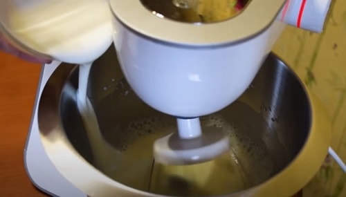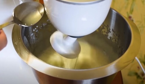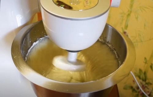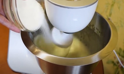 - Збийте міксером, щоб маса стала густою, засипте цукор. Продовжуйте працювати гаджетом, поки суміш не загусне.