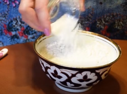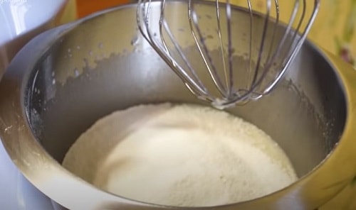 - Налийте в миску кисломолочний напій, додайте цукор, ванілін, соду. Розколотіть суміш, і добре збийте.