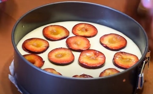 Перелийте масу у форму, розподіліть по поверхні фрукти, поділені на половинки.