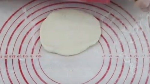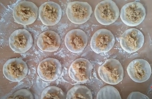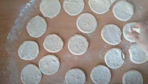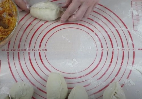 - Розділіть тестовий ком на 12 частин. З кожної зробіть корж. У середину покладіть капустяну начинку, закріпіть краю.