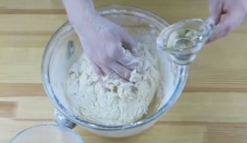 Потім замішують тісто руками. Щоб воно не бралося, влийте ще крапельку жиру.