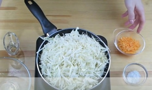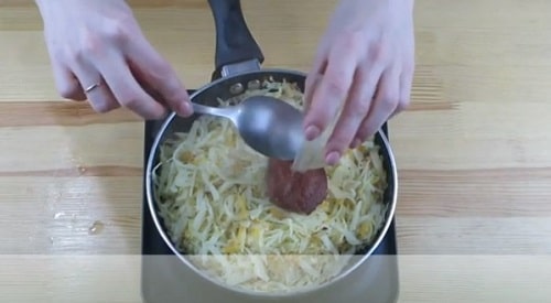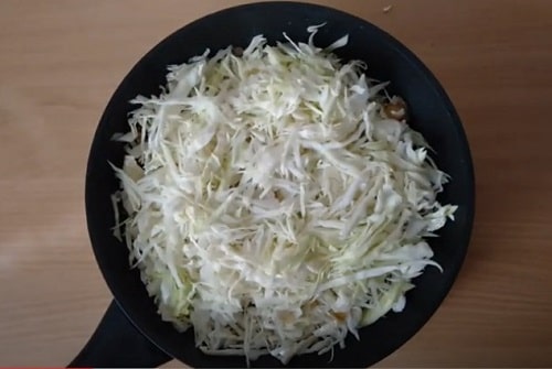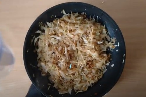 - Капусту з морквою можна загасити на окремій сковороді. Або закласти до м’яса, якщо сковорідка досить містка. Коли овочі стануть м’якими, з’єднайте їх з м’ясом, перемішайте і охолодіть начинку.