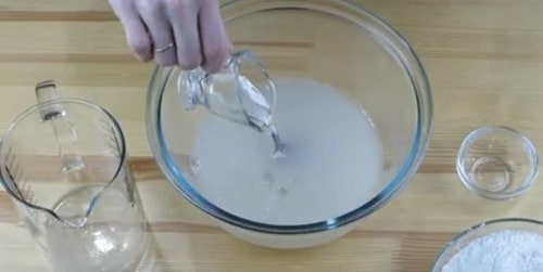 - З’єднайте в мисці кисломолочний напій, сіль, харчову соду, солодкість. Розколотіть суміш, прикрийте плівкою, залишити на столі на чверть години. Гасити соду немає необхідності, кефір сам зробить це.