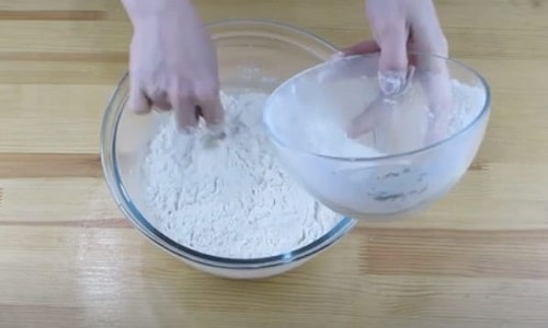 - Почніть підсипати муку. Додавайте потроху, кожну порцію ретельно вимішуйте.
