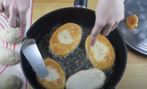 Налийте на сковороду олію (не шкодуючи). Гарненько його розжарте. Викладіть заготовки пиріжків на деякій відстані, оскільки вони пролунають вшир і вгору.