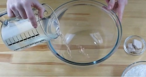- Засипте в підігріту воду дріжджі, розколотіть. Додайте цукор. Зачекайте, поки дріжджі запрацюють.