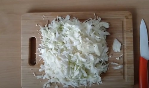 Для приготування начинки наріжте капусту тонкою соломкою. Розігрійте на сковороді олію, викладіть нарізку.
