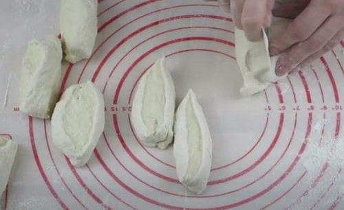 - Наріжте з тіста заготовки для ліплення пиріжків. Розташуйте по центру начинку, зліпіть напівфабрикати.