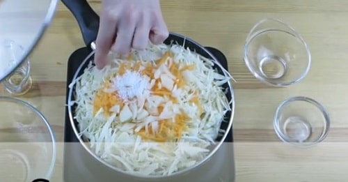Потім додайте капустяну соломку. Продовжуйте обсмажувати овочі.