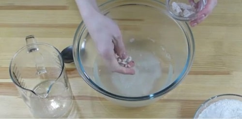 Додайте сіль з цукром. Розкришите живі дріжджі, розколотіть суміш.