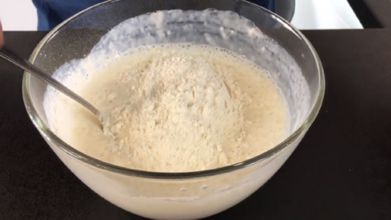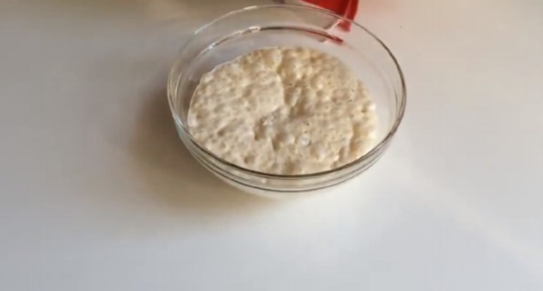 В підходящу ємність влити половину кефіру, підігрітого до 35-40 градусів, додати ложку цукру і ложку борошна, дріжджі і перемішати. Залишити на кілька хвилин, щоб дріжджі ожили. На поверхні суміші почнуть з’являтися бульбашки.