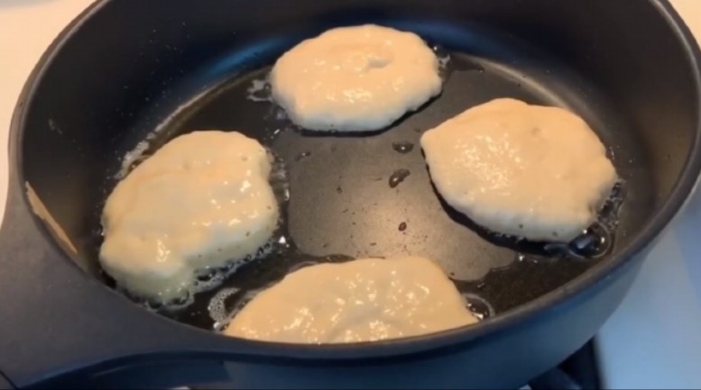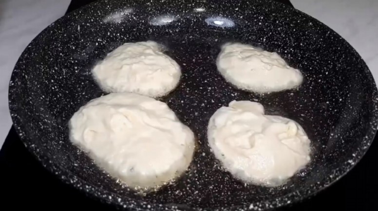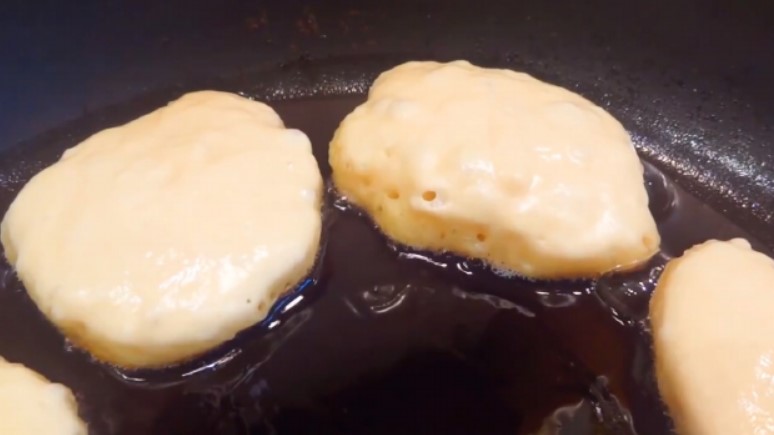 4. На розігріту сковороду ложкою відсаджувати оладки смажити на середньому вогні з обох сторін. Зовні вони зарум’яняться, при перевертанні на другу сторону починають інтенсивно підніматися.