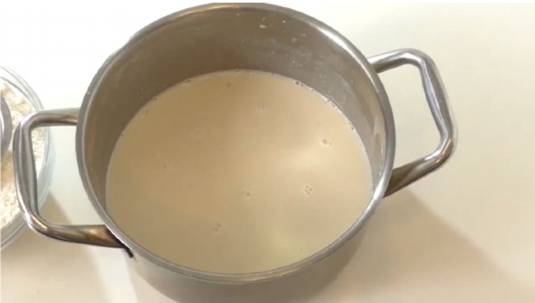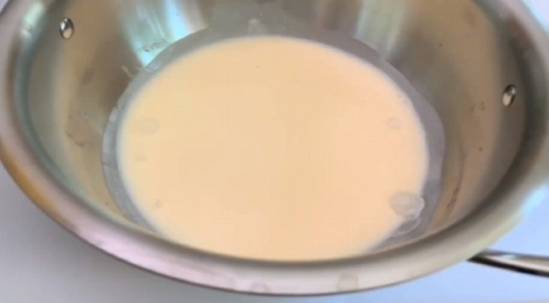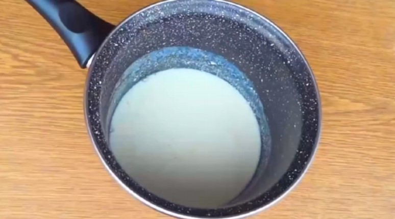 1. Кефір перелити в товстостінний кухлик і нагріти на повільному вогні так, щоб він згорнувся, але не закипів.