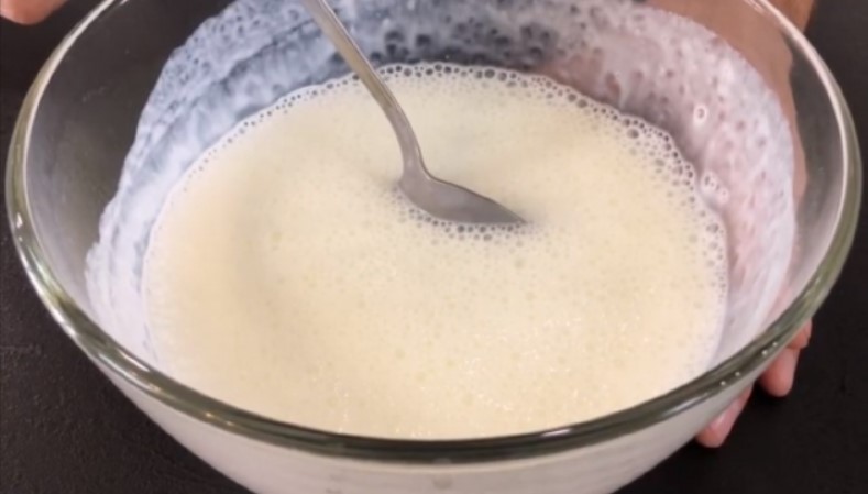 1. Кефір вилити в зручну миску. Додати в нього соду і перемішати. Маса почне активно пузиритися. Сода вступає в реакцію з кислим середовищем кефіру, нейтралізується з виділенням вуглекислого газу. Це і є наш науковий компонент.