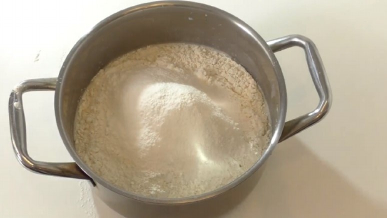 3. У маленькій мисці змішати чайну ложу соди з ложкою борошна. Додати цю суміш в готове тісто. Швидко перемішати і більше не чіпати.