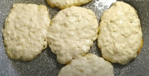 - Змастіть деко або форму маслом. Налийте ложкою заготовки оладок. Дотримуйтесь деяку відстань між ними, оскільки тісто трохи розтечеться.