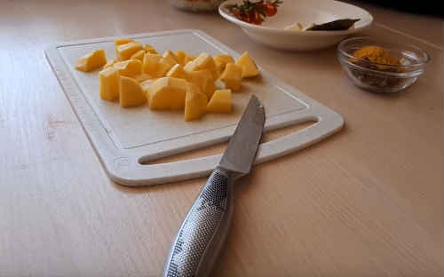 Почистіть бульби картоплі, поріжте кубиками середнього розміру.