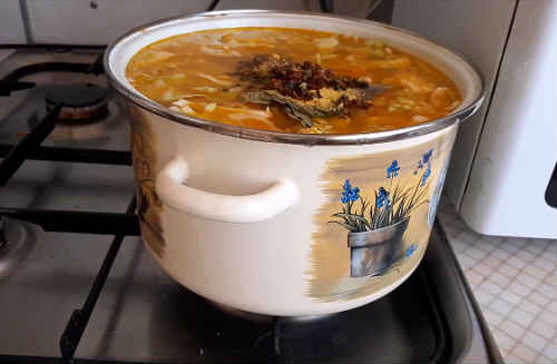 Коли овочі зваряться, перекладіть в щі засмажку. Розмішайте, покладіть лавровий лист, перець горошком, інші спеції. Посоліть суп.